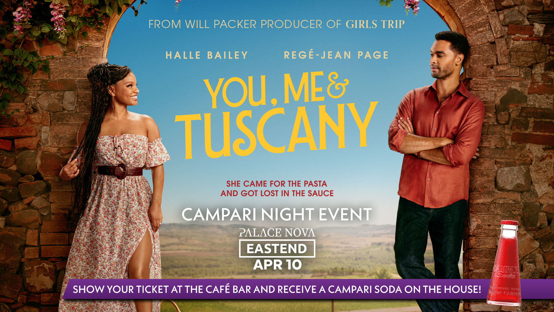 Get swept away on a wave of romance to beautiful Tuscany when you join us for this special screening of You, Me and Tuscany starring Bridgerton's Regé-Jean Page and Halle Baily from The Color Purple. Show your ticket at the café bar and receive a Campari
